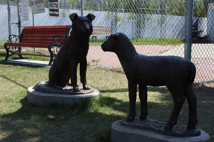 The Babysitter is a life-sized bronze sculpture of a sheep dog guarding his lamb.