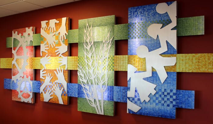 This piece is a diverse collection of mosaic tiles in four panels with intricate aluminum shapes that represent important elements of the community.