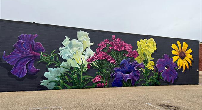The Thomas brothers got their inspiration from the flowers growing at Legacy Park in the Downtown of Fort Saskatchewan. "These floral murals are here to remind us that the combinations of shapes and colors always look great. They reveal the beauty and immense power of nature. It is so playful, colourful and screams summertime. Pieces are the type that make you stare at for long periods of time, discovering new details in the extremely rich amusing floral work."