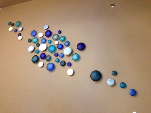 This piece is made of hand blown glass spheres each unique in shape, size and colour.