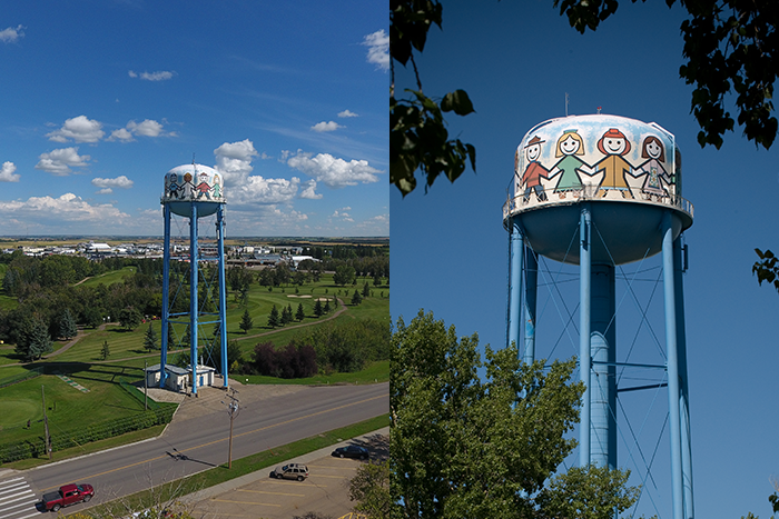 The theme for the mural, a series of cartoon people holding hands around the circumference of the tank, was conceived by a 13-year-old girl from Fort Saskatchewan during a 1995 contest to give the 38-year-old water tower a facelift. It was then executed by the artist and an assistant over a 3-week period.