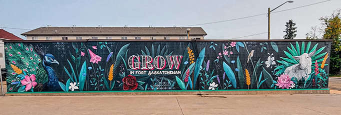 From the artist: "Each flower, plant, symbol was carefully selected to represent many of our newcomers in our city. Some elements that were included were the red rose, heliconia, letter "W" to represent Columbia, the peacock, lotus, letter "O" to represent India, the nightingale, wheat, cornflower, letter "G" to represent Ukraine, the sampaguita, anahaw leaf, letter "R" to represent the Philippines, the plum blossom to represent China, the Lapageria rosea to represent Chile, and lavender to represent Portugal. The sheep was also added as they have become a staple to Fort Saskatchewan for over 30 years."