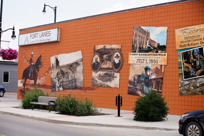 The concept of the mural is based on the classic “greetings from” postcards and was designed to not only welcome visitors into Downtown Fort Saskatchewan, but also act as a backdrop for visitors to snap a picture and share their adventures. Each letter in the mural celebrates local landmarks and scenes.