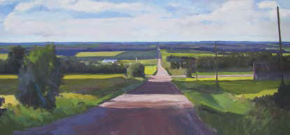 An acrylic painting that depicts a rural road among the lush fields near Fort Saskatchewan.