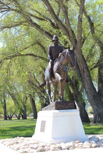 The life-sized bronze statue of Inspector Jarvis who chose the perfect spot for a new North West Mounted Police Fort in 1875.